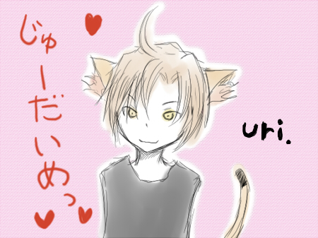 何サンドになるのかな…。 見ているかどうか解りませんが、私にとって獄ツナ神であるお方への捧げ物。 獄ツナ瓜の会、是非とも設立していただきたい……!真っ先に入会希望ですとも(*´д`*)ハァハァ 「じゅーだいめっ!オレ、もっともっと強くなって、じゅーだいめを守ってやるからな!」 「うん、ありがとう。でも、無茶しちゃだめだよ?」 「はーい!」 「……10代目!オレだって、もっともっと強くなります!ずっとあなたをお守りしますから!」 「わ、わかったから、ちょ……どさくさに紛れて抱き付かないでってばー!」 「あー、はやと、ズルイ!オレもぎゅーってするー!」 「…飼い主に似るってほんとだなぁ、もう……。」 我らが10代目は、嵐の主従に愛されていたらいいのです(笑)。 何時か、蕎麦でも何か捧げたいです……!